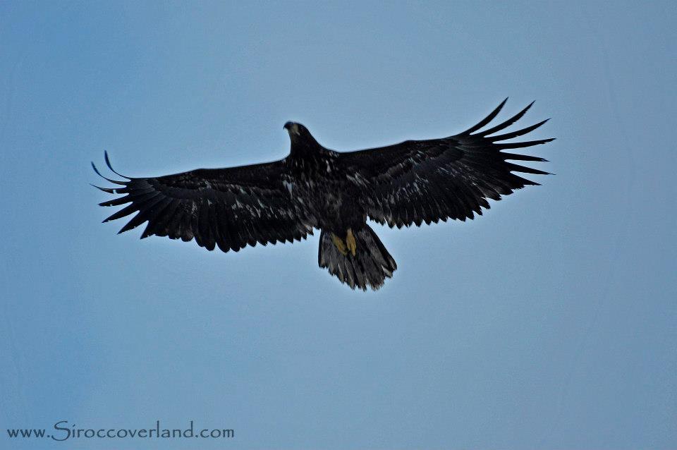 The next day everyone cracked on to Alta which was a 700 km push from our wildcamp and I knew this was out of the question for us. I let Jason know and we went at our own pace. A rumbling and drive-line slack had been on my mind the previous few days and it had gotten to the point where it was vibrating heavily through the steering wheel under load. Checking the front revealed nothing but the rear most propshaft UJ (joint) had a large amount of play in it. Luckily I had packed spares and we stopped at a garage in a small town who agreed to let me use their bench vice (for free). All swapped out in about an hour we were back on the road and stayed in a small hotel in Bardufoss that night around the halfway point. Now a day behind the group we continued north to Alta. We had to stop for a while as we spotted a number of White-tailed Eagles fishing in one of the Fjords. As they were nesting in the cliffs adjacent to the road we got a good view of them as the soared overhead.