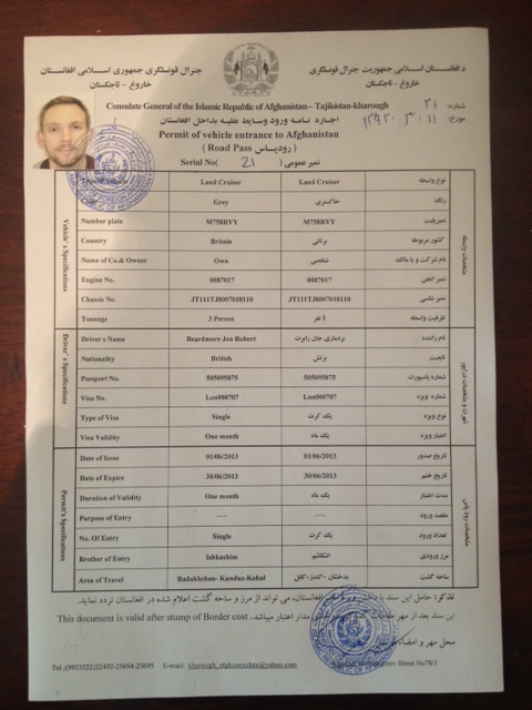 Its official, we F^&$ed it up. But in saying that nobody told us otherwise and previously people did not have this problem. So what went wrong? We picked up our Visa’s from the Khorog Consulate in Tajikistan and went on our merry way to the border at Ishkashim. At the border we were asked for our vehicle documents so we presented our V5 (British registration document known as a Tech-Passport elsewhere) to which the response was ‘Not that, the other one’. So what is the other one?