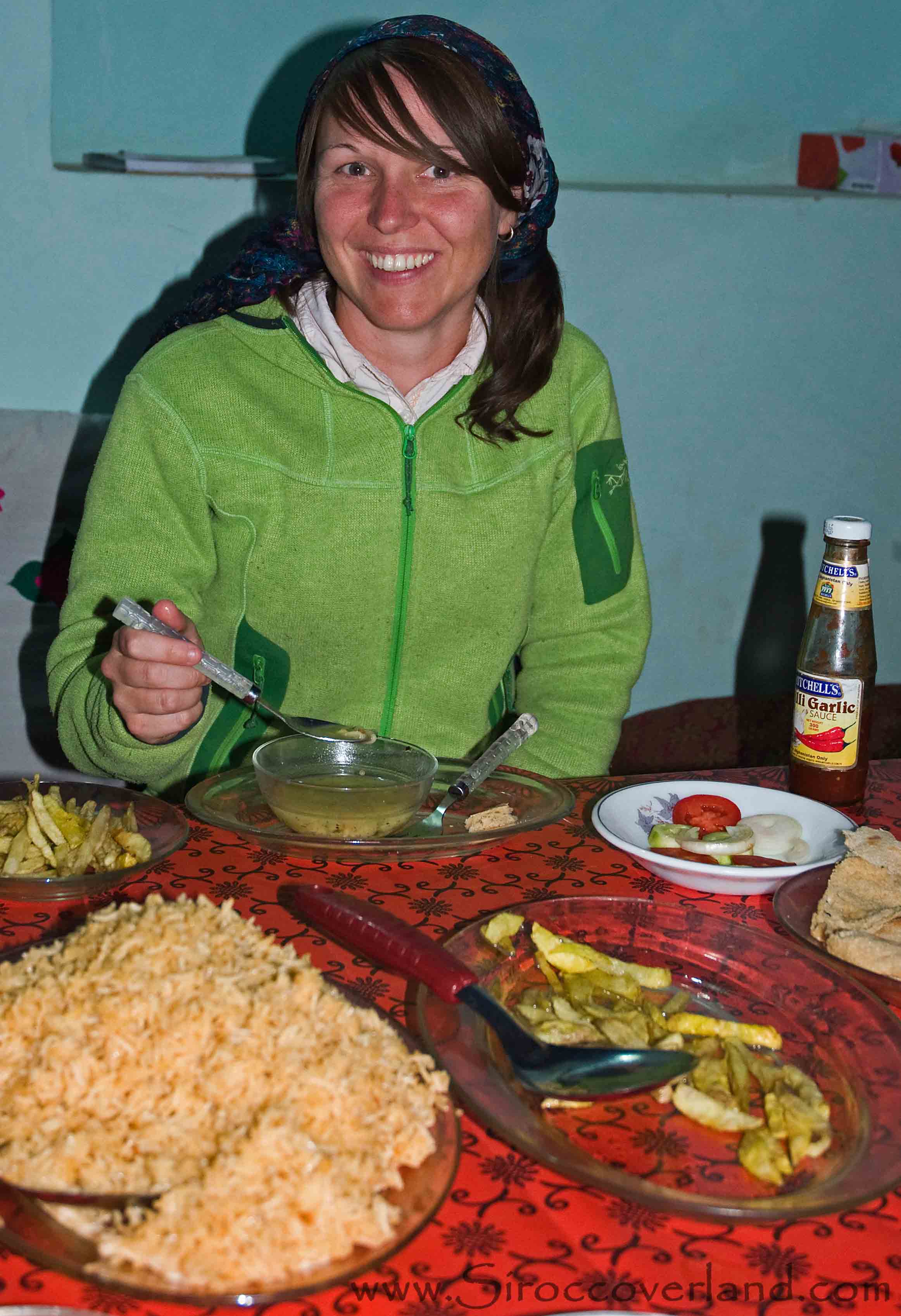 The Afghan police phoned for a taxi and a guide who came to get us from the border. We quickly got some bags together and got going just as night fell. Behind us was the military police pick-up as we raced into Eshkashim toward our Guesthouse for the night. Both myself and Adam had an uneasy feeling about leaving the vehicles with the Tajik police. They were outside, visible from the road with only a small wall to guard them. We decided there was no point in being there without our own transport as the costs in this region are huge compared to other Central Asian countries. So over dinner, we decided we would leave the following morning. The food was a great spread, something we had not experienced in other countries. Maybe it was our tight budget getting in the way? Breakfast the following morning was also great, although Adam likened the beds to Taliban torture racks which was probably not far from the truth.