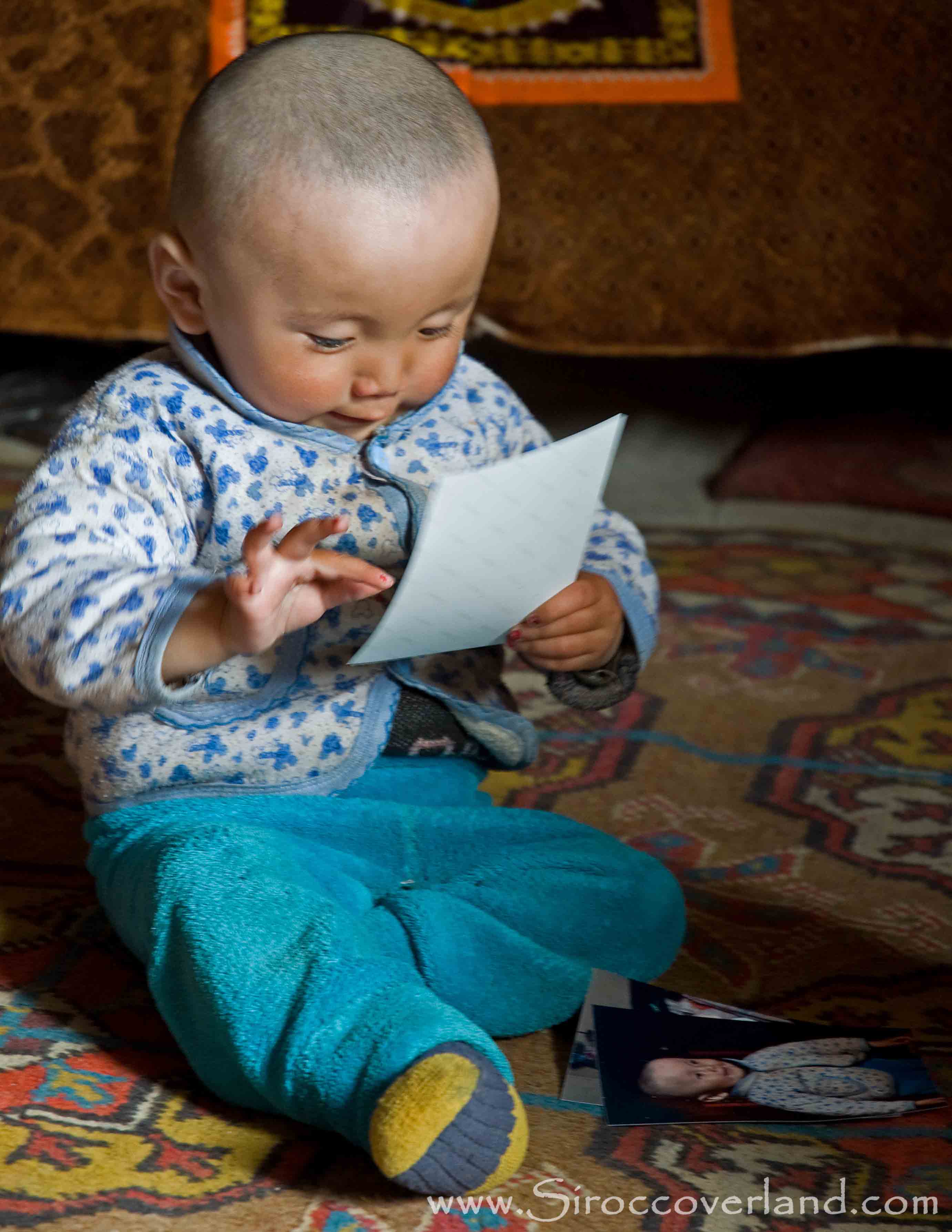 We went in search of the dirt track heading east but it was difficult to find. Following the GPS we crossed open land before picking up a faint track which would take us to the Ak-Jar hot springs. It was rough going following the river and it was easy to see how it would become impassible during the rains. Ak-Jar proved to be a small trickle but further down the road (whilst I was taking photos of Yaks) Adam’s bike was outside a small building. When we knocked on the door we were invited in by a shy Kyrgyz women. Adam was sat there drinking tea and eating bread! It was a great experience. We spent sometime taking photos of her and her young son and then I printed a few out on our portable printer (Canon Selphy) for her. The room was sparse, we were about 75km from the main highway and a long way from a town. Everything was run on one 12v battery but they seemed to have everything they needed. We gave a clutch of pens, pencils and notepads to her for her son before we left and from here we picked up the main Pamir Highway.