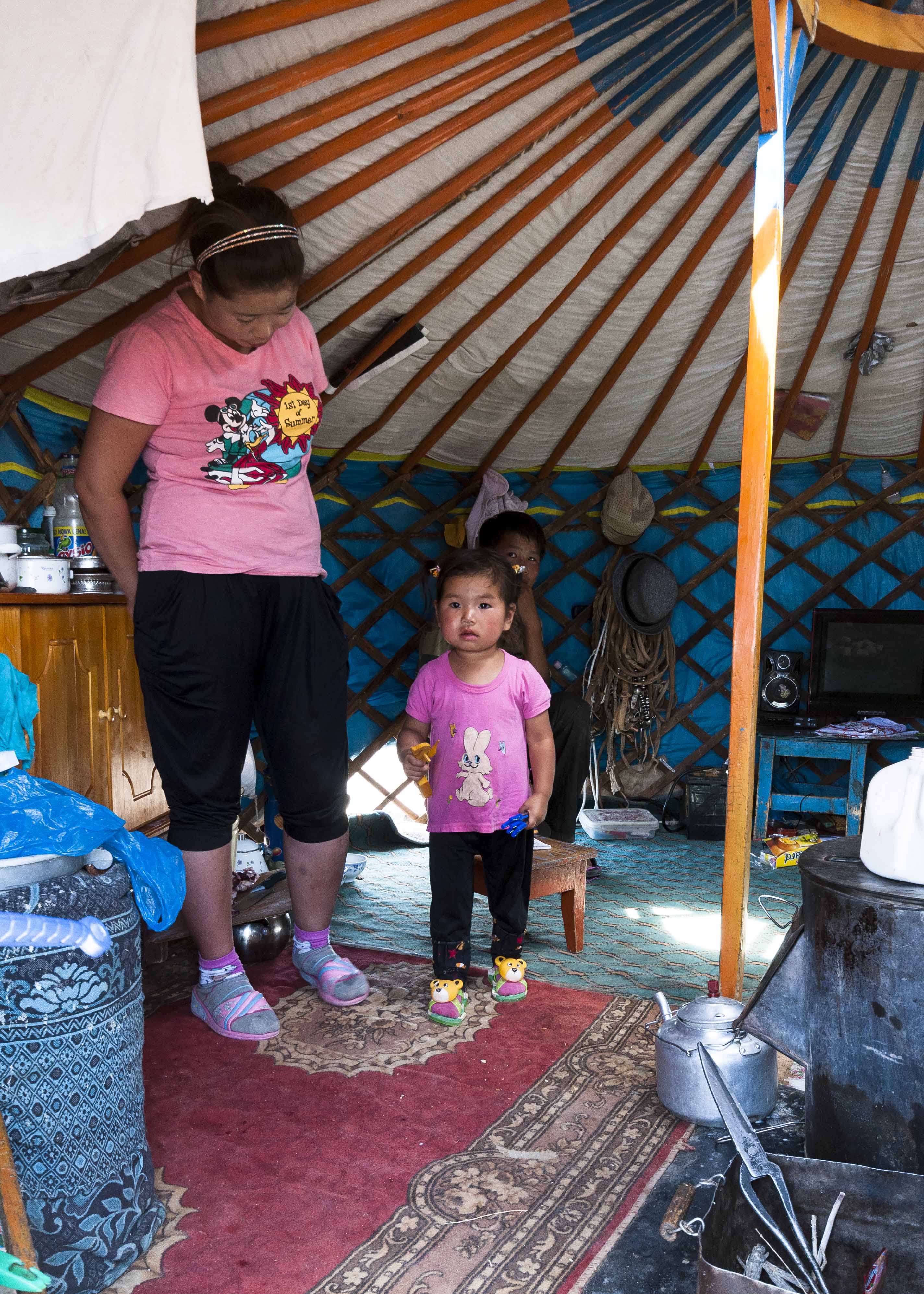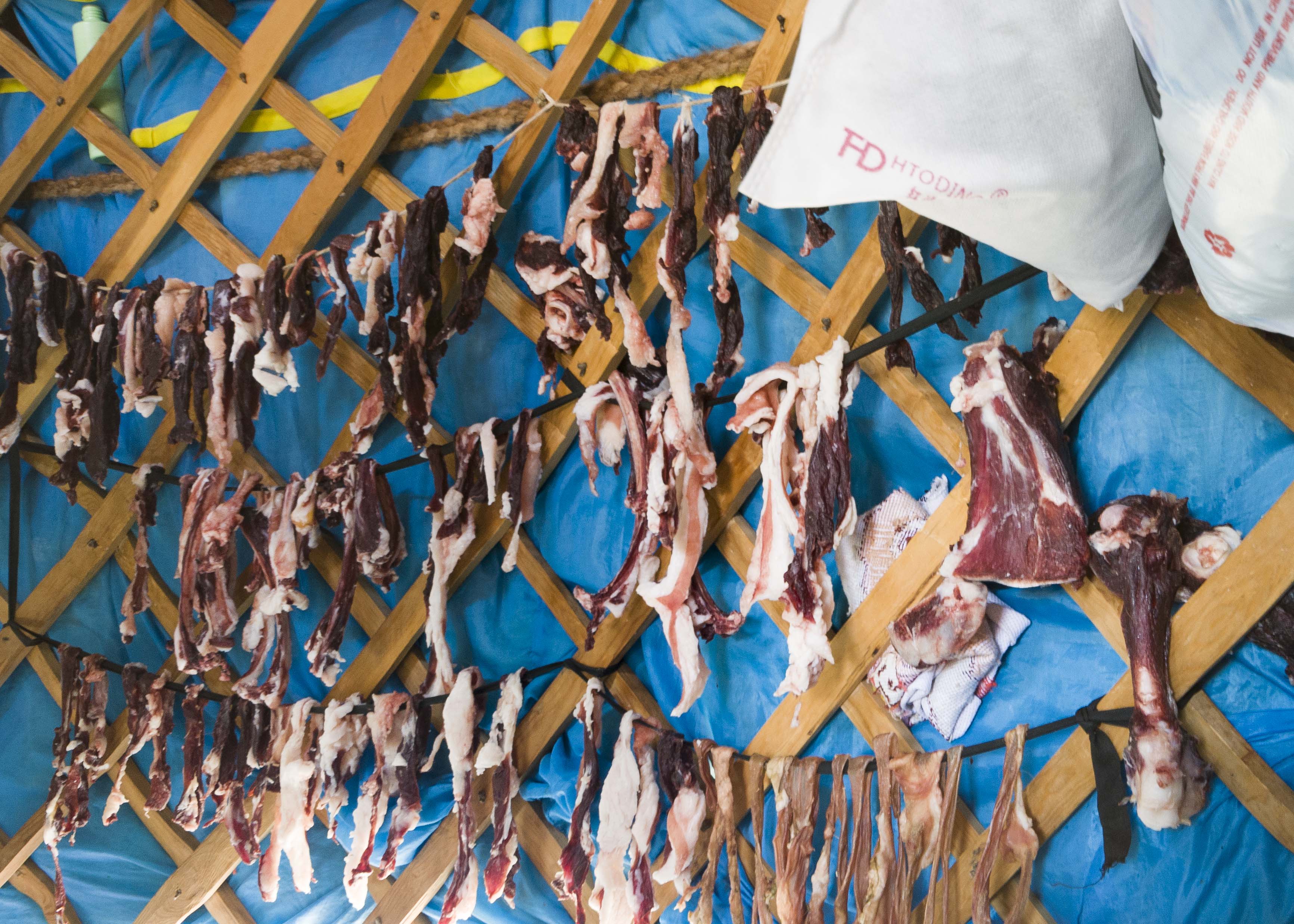 We drove on towards the “singing sand dunes”, Khongoryn Els, following the sandy tracks. We had to traverse just south of them for their entire length to be able to cross them on the eastern end. On the way we passed a ger next to a well, and decided to stop to see if we could draw some water. The family inside invited us in, where they offered us hard cheese and breadsticks. Around the ger tucked into the felt of the roof wheel were toothbrushes and toiletries, while drying meat was tucked into the walls between the trellis. Storage space is obviously limited but they had a good solution! We took a photo of the family and printed it for them, before continuing our journey to the dunes.