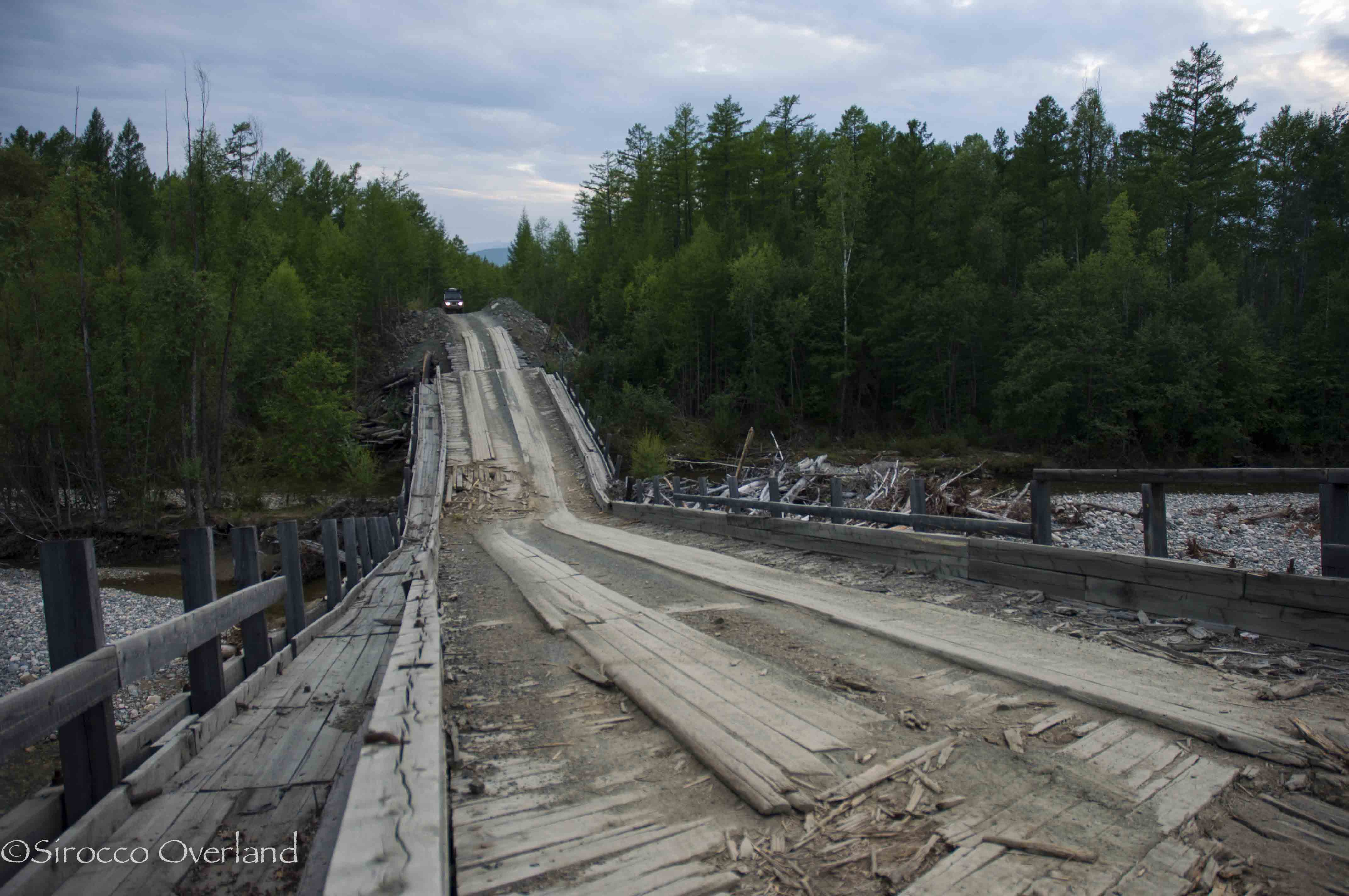 We left Severobaikalsk to drive the route towards Tynda, which was over 1300km away. We had heard reports from locals that the road was closed after Taksimo, about halfway, due to recent floods and high rivers. We encountered several rickety wooden bridges, which all added to the excitement, and decided to call it a night when we reached a long, collapsed but still superficially intact bridge. We had seen the huge Kamaz trucks drive through the river below rather than use the bridge but, as the water was halfway up the Kamaz trucks, we faced the dilemma of risking the unknown collapsed bridge or getting washed downriver if we drove through. Definitely a decision for the following morning.