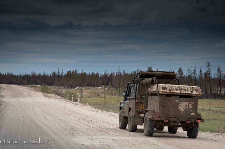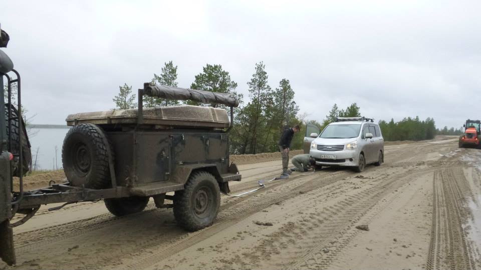 A couple of hours after leaving Mirny, we reached the ‘barge’ – it was basically a floating platform pushed by a tiny fishing boat. Not exactly what we were expecting! The next three days were spent driving along the Vilyuysk trakt east towards Yakutsk, a sandy quagmire of a road in the rain. The route is some 1300km between Mirny and Yakutsk and as is so often the case in this part of Russia there is only the one road. There are 4-5 river/barge crossings and the trackt weaves its way through traditional Sakha/Yakutia villages. Wild camping was surprisingly difficult in this wilderness, as the forest was impenetrable and the logging tracks leading off were so muddy we would have gotten stuck in no time. Luckily there were the occasional clearings, empty except for scrap metal and old tyres from logging trucks. Sometimes we camped in old sand quarries where there was space and plenty of firewood. We hunkered down in the rain, building fires to keep us warm in the ever-colder evenings, and waited for the late sun to set. That’s the problem with being so far north: the sun would stay up until gone 10pm and we were relying on night to conceal our camp spots! After what seemed like several days on the track recovering vehicles, towing sedans through deep sand sections, Griff had to plug a tyre that had been impaled by another nail (the same tyre had already been plugged by Mischa at the Lena barge), and noticed that the brake pads were worn down to the metal! The wet sand acted like a grinding paste between pad and disc. Luckily we had some emergency spares (but how long would they last?), which Griff fitted in the pouring rain late one evening while I cooked dinner over a huge fire.