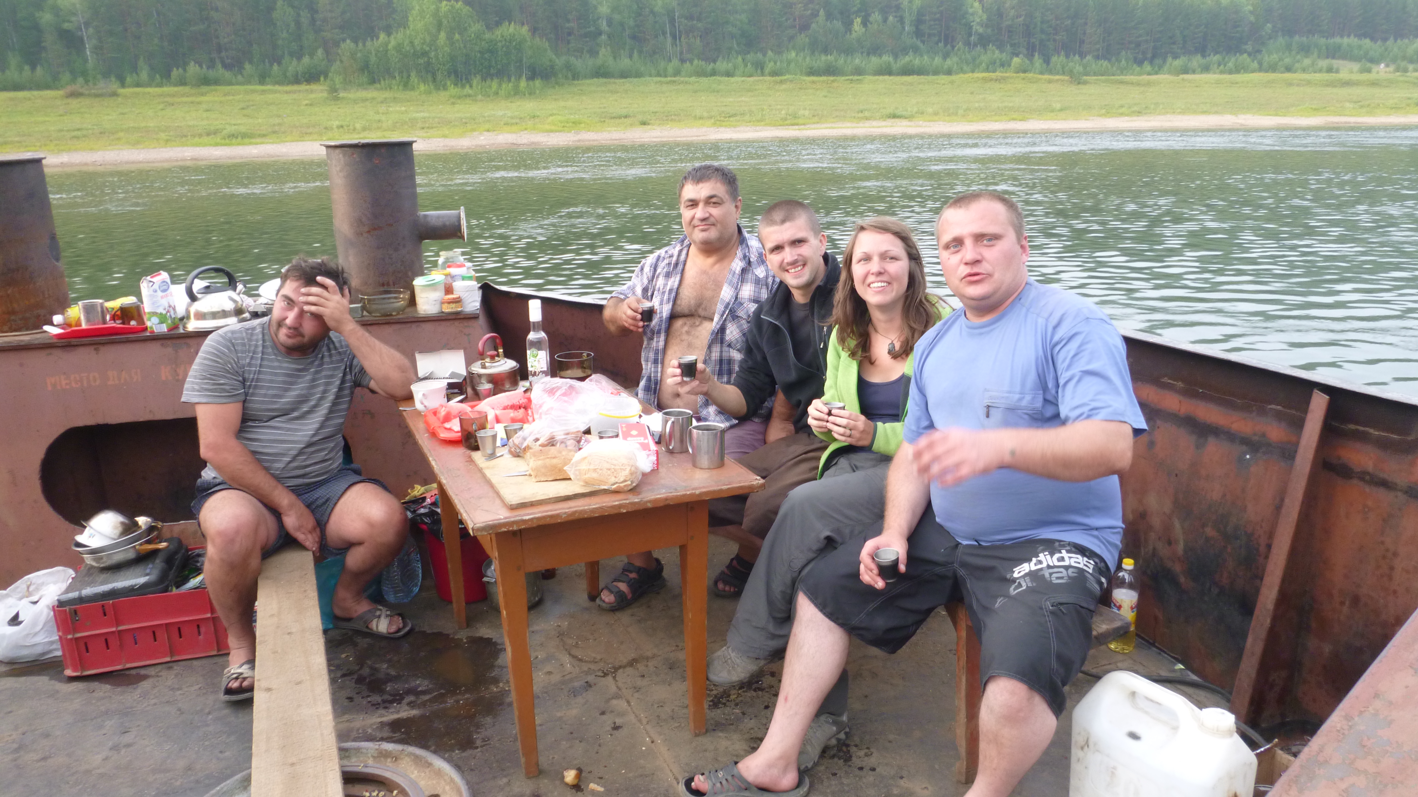 After much kerfuffle and lots of misunderstanding at the booking office, we thought we were booked on. So we rushed into town to buy supplies ready to board at 4pm. But it turned out we were returning at 4pm to make our booking, and the barge didn’t actually leave until the following morning! We had to measure the exact length of the rig, and pay per metre, although we were unsure what the rate was. All of this was explained to us by a couple of really lovely truck drivers who had taken pity on us after seeing our bewildered faces. Andrey, Mischa and their friend Ilya (who spoke a little English) told us we had to wait until morning, and see which (if any) barge had room for us, so we had to camp in with the trucks in the secure yard. We still weren’t sure if we would be travelling, or how much it would cost, or even how long it took, but we went with the flow and enjoyed the company of our newfound friends.