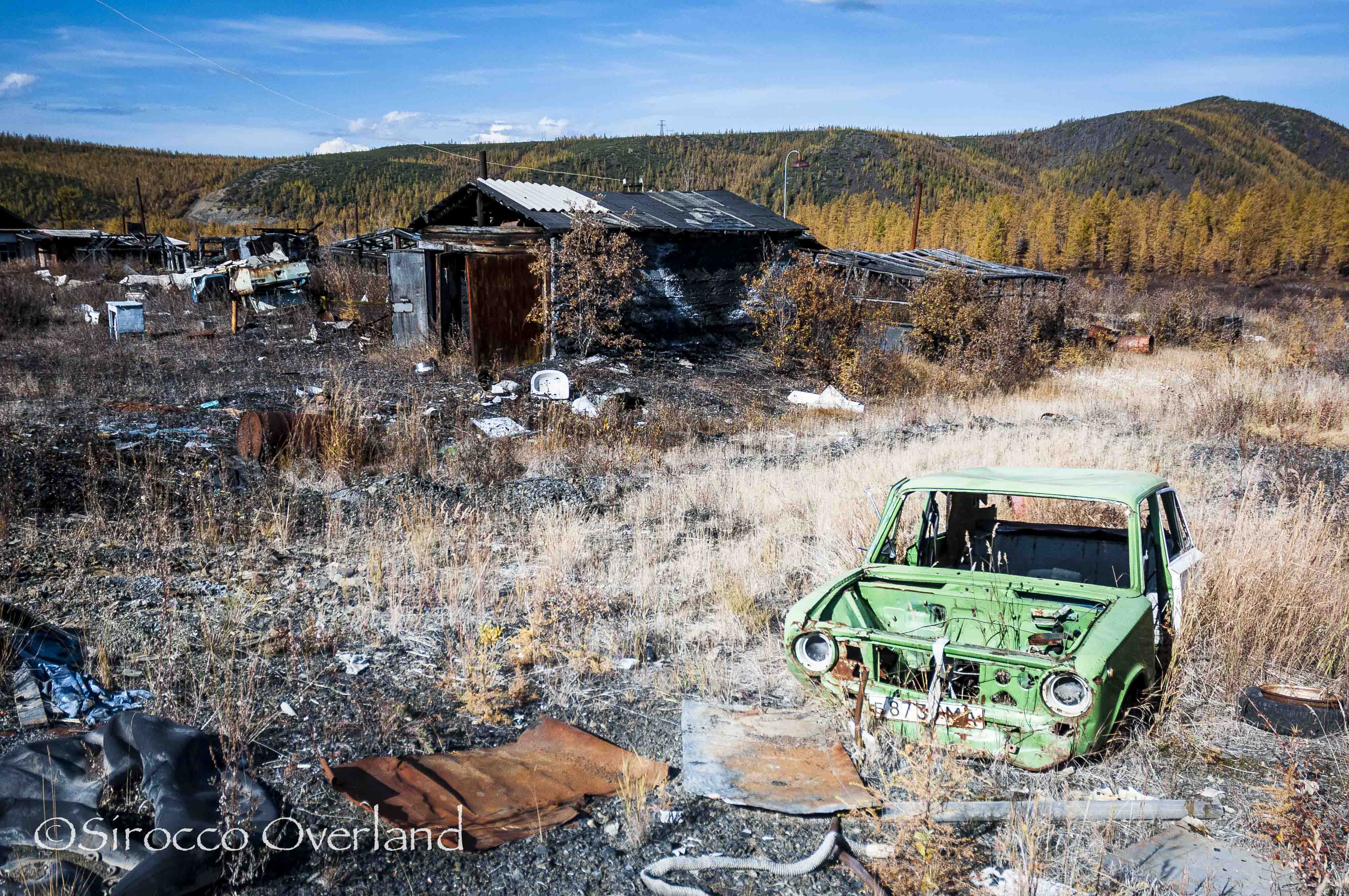 We drove around the houses on the city outskirts, past the power plant and into the centre along broken and twisted concrete roads. We walked into shops, the primary school and the town hall, all the time looking for signs of life. The area has an eerie, lost feel to it, due in part to personal items littering the ground. A child’s forgotten shoes left by coat pegs in the school; books on shelves or strewn across the floor of homes; weighing scales from the local shop left in the front garden. It looked as if everyone left in a hurry with only what could be carried in their vehicles, taking only the essentials. Vehicles that were not up to the job of transporting their owners sat in front of houses, tyres flat and sunken into the ground. Greenhouses, so vital in this harsh Siberian landscape to supply fresh vegetables in the short growing season, slanted to one side with glass long punched out and overtaken with weeds.