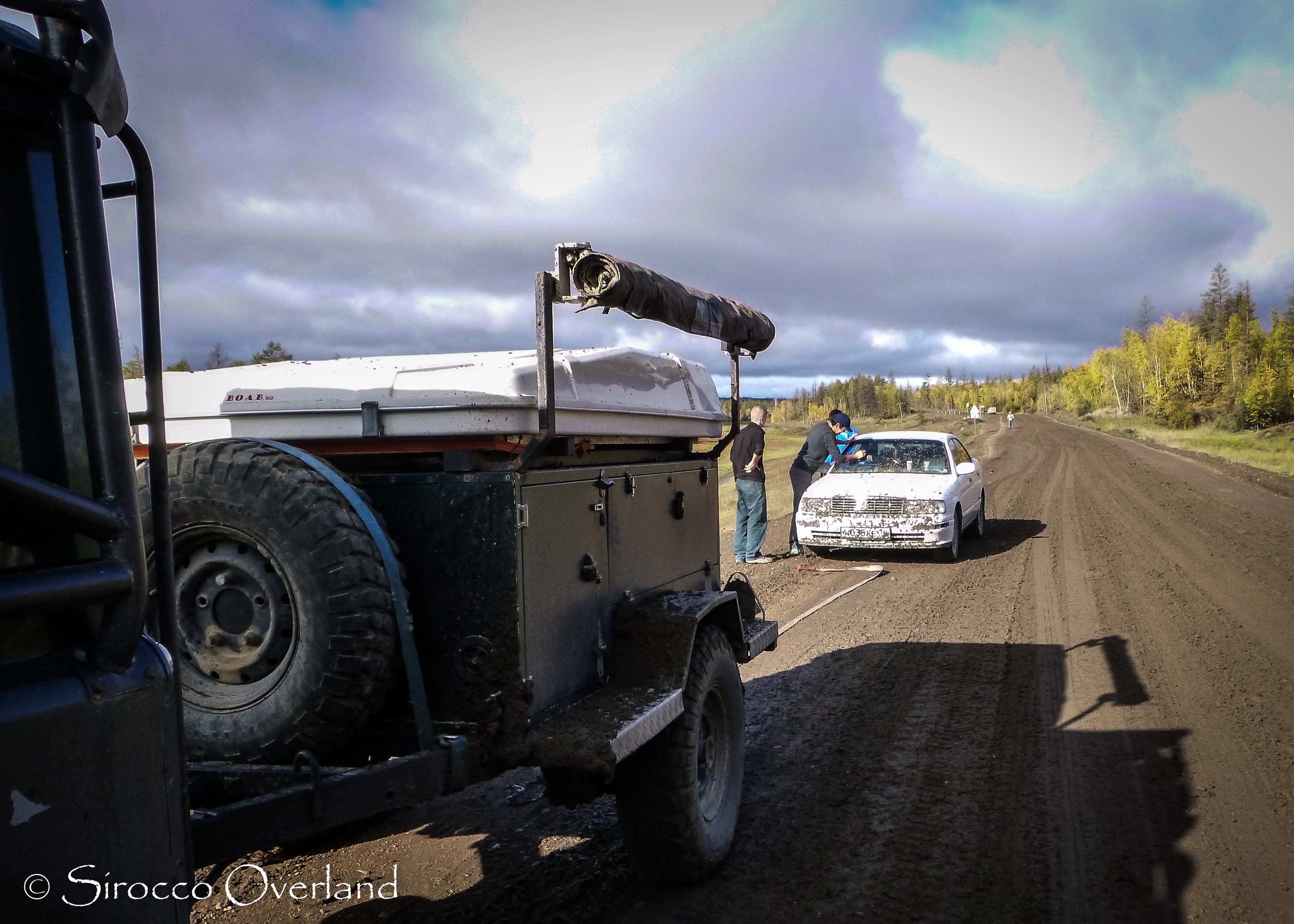 After a huge vehicle scuffle to get on the barge (which we won), we crossed the Lena River and picked up the main highway that we would be on for the next two weeks. When I say highway, I mean a sandy potholed dirt road with almost two lanes. We picked up the pace and drove into the night before finding a spot off the road to camp. The next morning we awoke to rain which would be with us on and off for the next 14 days. We stopped to help tow some locals to the village they lived in which proved to be quite difficult for them, as the trailer was kicking up large clumps of mud, smearing their windscreen. After dropping them off at a café, we said our farewells and continued on.