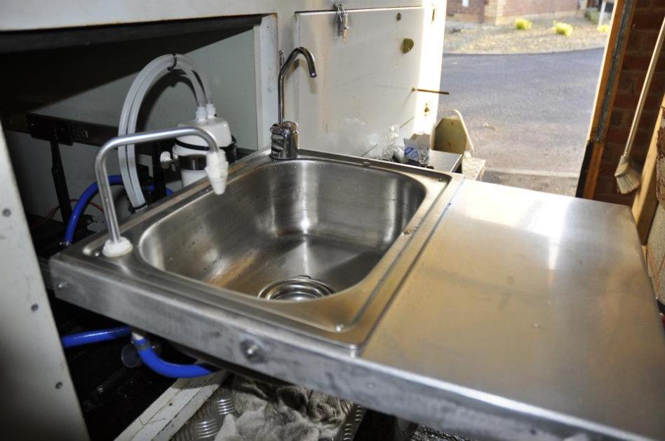 slide out 600mm sink unit with filtered/unfiltered taps drawing from 50L tank using an on demand flojet pump.