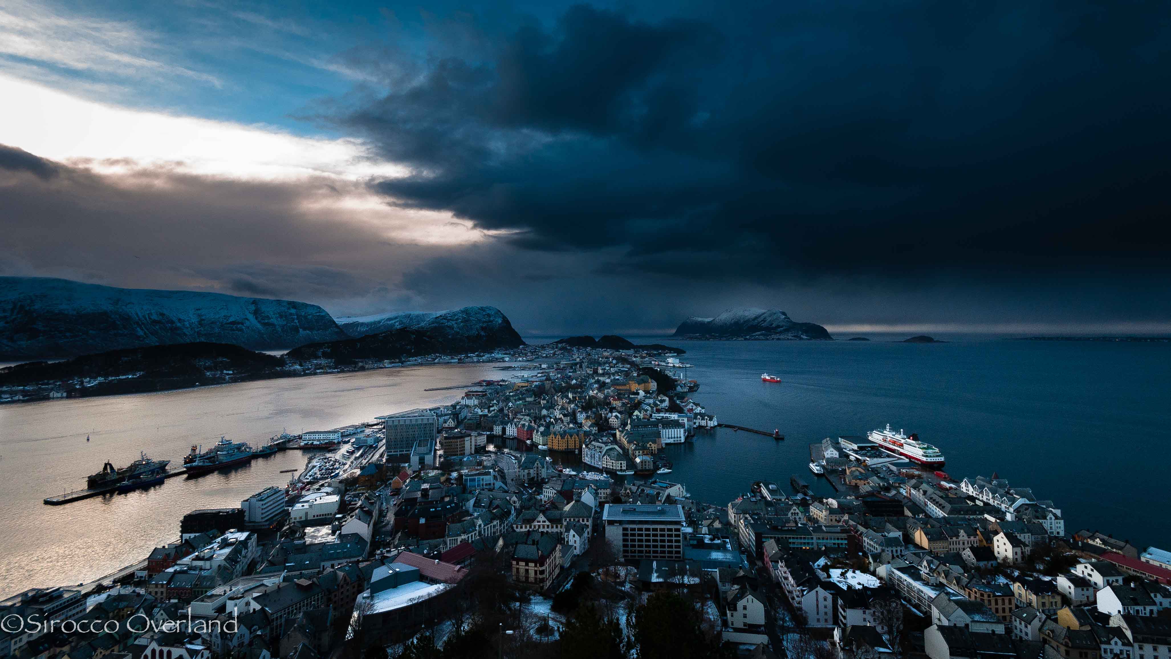 Alesund, an ‘out there’ port town in the Fjord region of Norway. It took us a fair while to reach this place, catching a multitude of ferries and crossing many icy mountain passes. It was worth it though, the air temperature rose to about -4c so it was a little warmer than the previous week. I had to climb around 300 icy covered steps to get this photo and there wasn’t a handrail at all times. It was pretty tricky as the sun was setting and our parking ticket was expiring. Worth it though as I am sure you will agree.