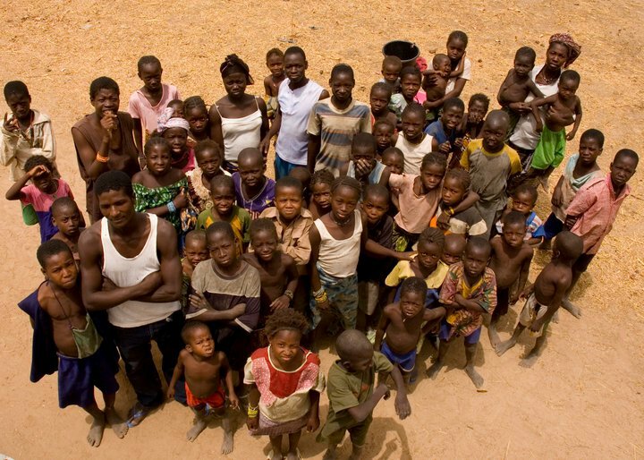 This village in particular is north of Mora Mora in the de Boule NP. Villages here do not have motorised transport so when our Land Cruiser pushed through the bush the whole village came out to meet us. With mud huts so close together, the villagers moved their firewood aside and congregated on the edge of the village to see us off. I took this photo from the roof of the Cruiser. The curious look from the children is due to them never seeing a camera before.